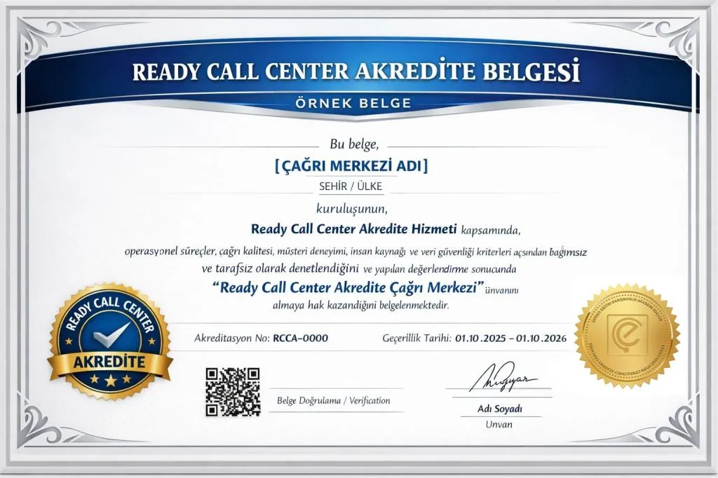Ready Call Center Akredite Hizmeti, çağrı merkezlerinin operasyonel yeterliliğini, hizmet kalitesini ve müşteri deneyimi yönetimini bağımsız, objektif ve ölçülebilir kriterler üzerinden değerlendiren kapsamlı bir ölçme ve belgelendirme sistemidir.